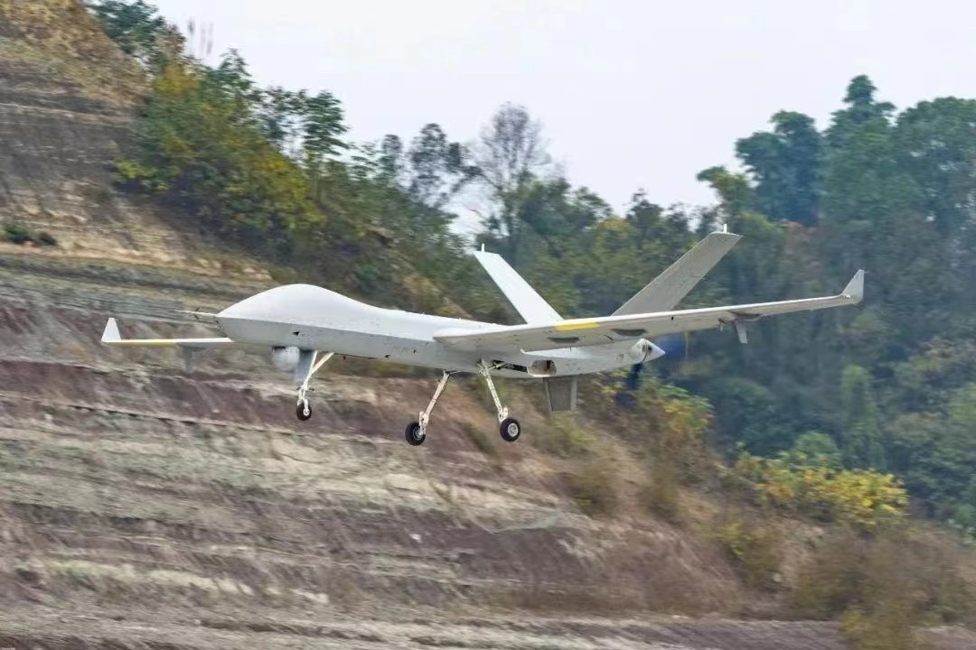 中国自研的翼龙系列无人机,可以全自主起降、爬升巡航、低空通场绕飞,是中国自主研发的中高空、长航时、多用途无人机系统。