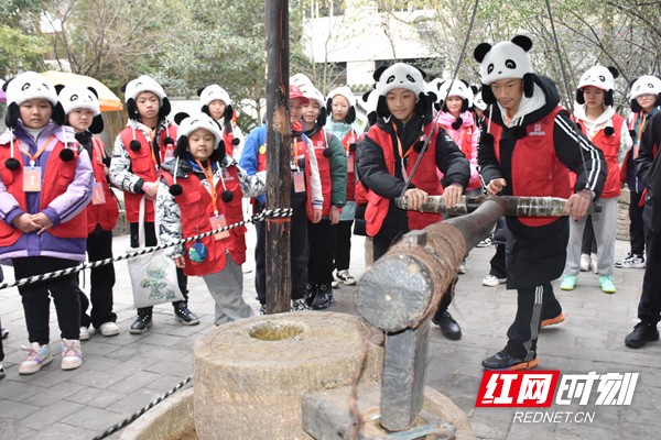 “小辣椒”们在成都川菜博物馆体验使用传统工具制作现磨豆浆。