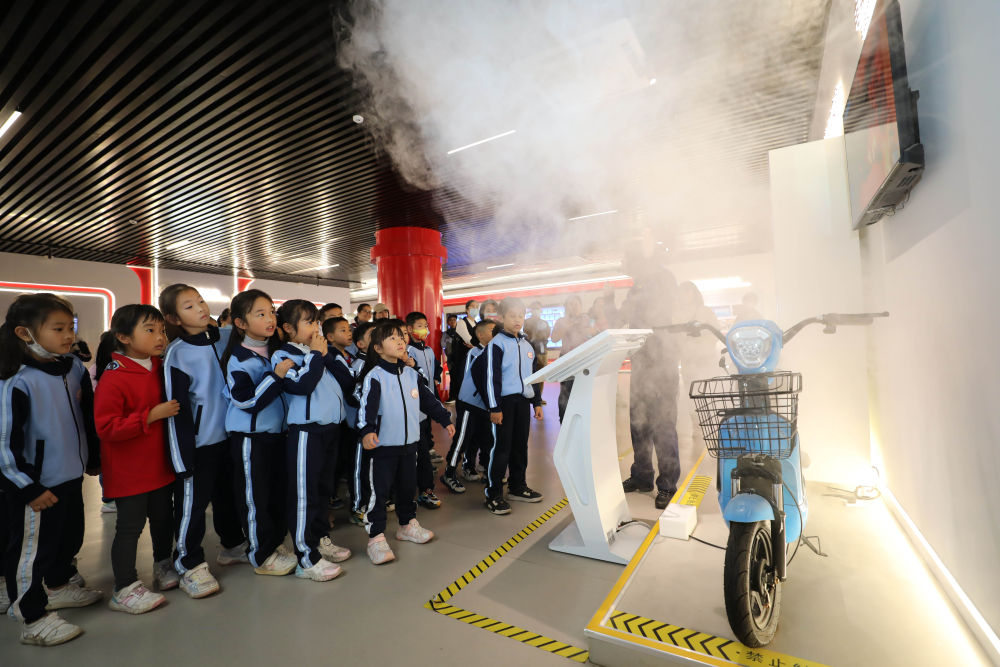 1月6日,在福建省厦门市消防科技教育馆,厦门市槟榔小学学生观摩电动自行车火灾实验。新华社发(曾德猛 摄)