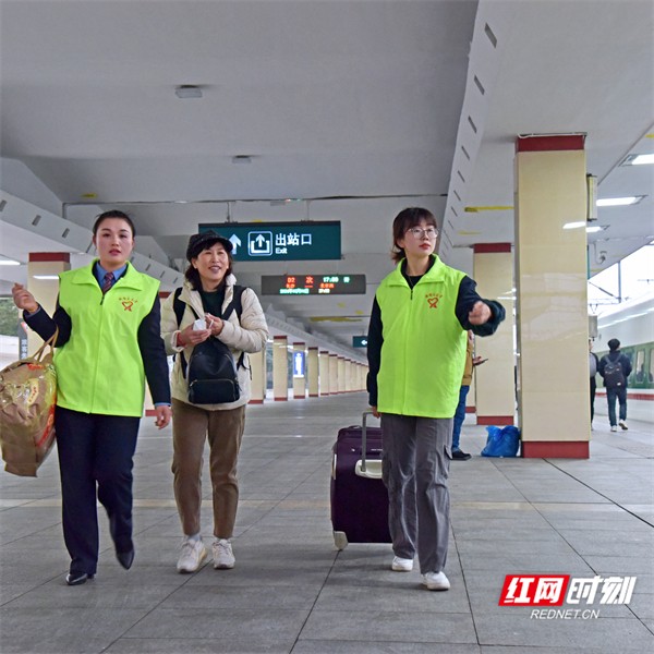 3月4日17时30分,长沙站1站台上,“学雷锋服务小分队”和青年志愿者一起,帮助旅客搬运行李、指引乘车。“红绶带”“绿马甲”彼此交织,相得益彰,守护客流井然有序。
