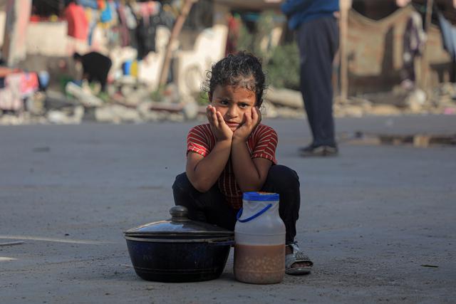 9月24日,在加沙地带南部汗尤尼斯,巴勒斯坦儿童领取救助食物后迫不及待随手取食。 新华社发(里泽克·阿卜杜勒贾瓦德摄)以色列方面则称,以方没有限制人道主义援助进入加沙地带,并指责联合国机构和相关援助组织没有及时运送物资。