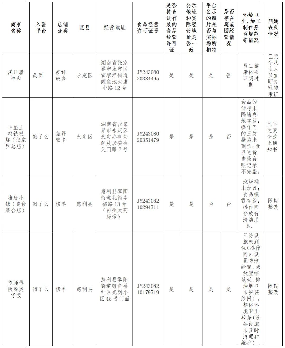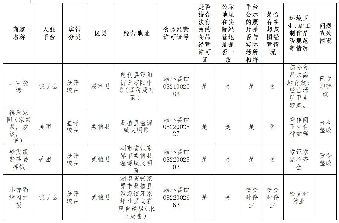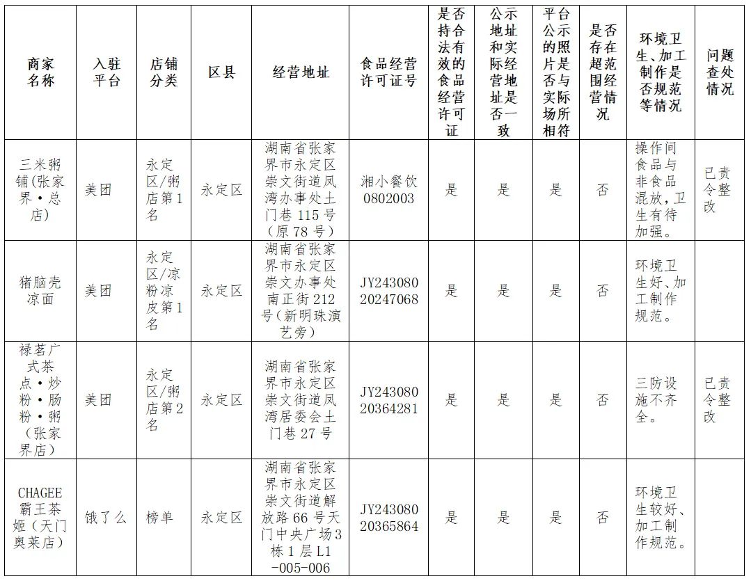 2024年9月,张家界市市场监督管理局对全市入驻美团、饿了么平台的外卖餐饮单位开展了“随机查餐厅”检查。本次检查随机抽查了榜单排名靠前、评分高分或订单量高的6家店铺和差评较多的6家店铺。现将检查结果公示,欢迎广大消费者举报食品生产经营领域的相关违法违规行为,监督市场监管工作。