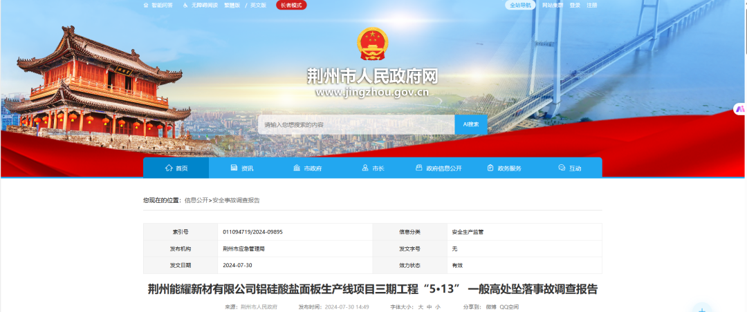 2024年5月13日,湖北荆州能耀新材有限公司铝硅酸盐面板生产线项目三期工程联合车间碎玻璃三号转运楼在筒仓安装前期作业时发生一起一般高处坠落事故,造成1人死亡。