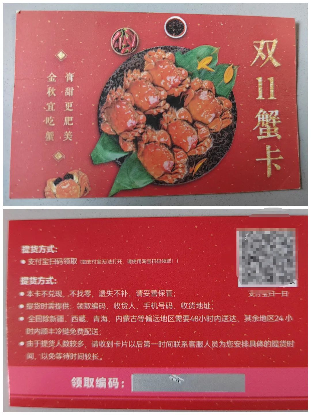 陈女士收到的快递,里面是印刷精美且充满高级感的信笺、感谢信和一张大闸蟹兑换卡。信笺封皮印有“正宗阳澄湖大闸蟹与您共享”字样,内侧介绍了烹蟹方法和存蟹方法。感谢信上写着:值此双11来临之际,某平台携全体员工向您致以最诚挚的祝福,在全网随机抽取10000名在平台有着5年以上购物记录的活跃用户赠送2388型(价值约500元)鲜活大闸蟹提货卡。蟹卡上的内容含糊不清,并没有标注公司名称、电话和提货有效期等。