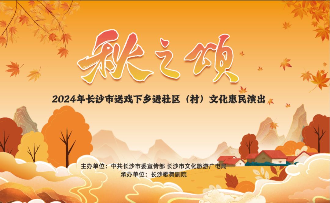 国庆节10月2日至7日期间,长沙歌舞剧院将陆续走进长沙市望岳街道,望城区乔口镇,浏阳市洞阳镇、龙伏镇、淳口镇,长沙县黄兴镇等地开展2024年长沙市送戏下乡进社区(村)文化惠民演出,敬请关注。