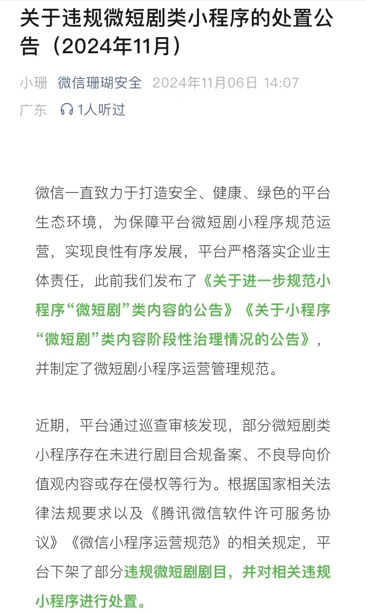 11月7日,微信珊瑚安全账号也发布公告,平台下架了重生、觉醒类多部违规微短剧,并对相关违规小程序进行处置。