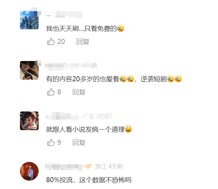 对于微短剧火爆出圈,有网友表示,“我也天天刷,只看免费的”“有的内容20多岁也爱看”“短剧80%靠投流,这个数据不恐怖吗?”