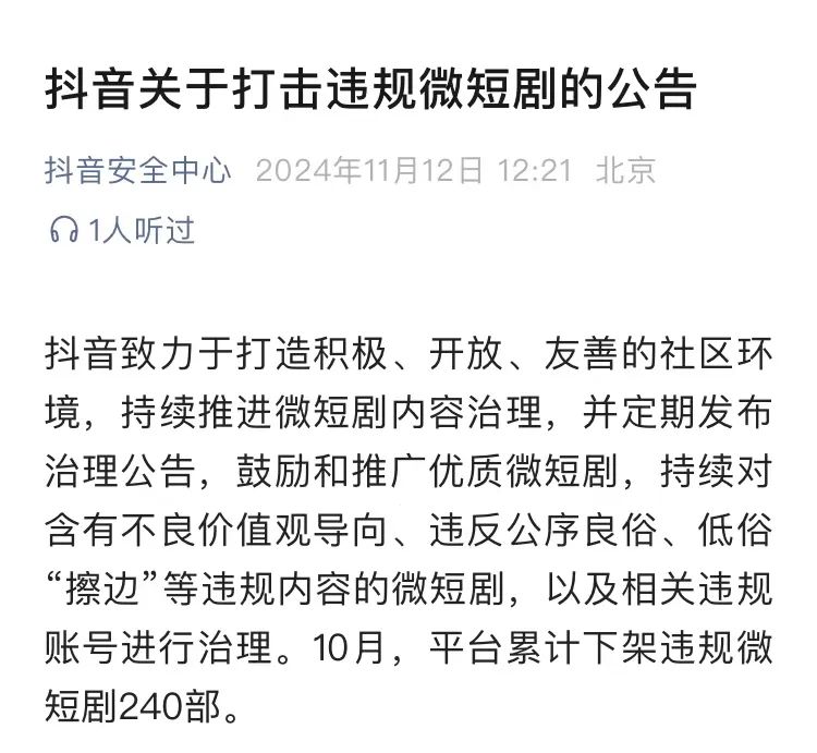 11月12日午间,抖音安全中心发布打击违规微短剧的公告。10月,平台累计下架违规微短剧240部。