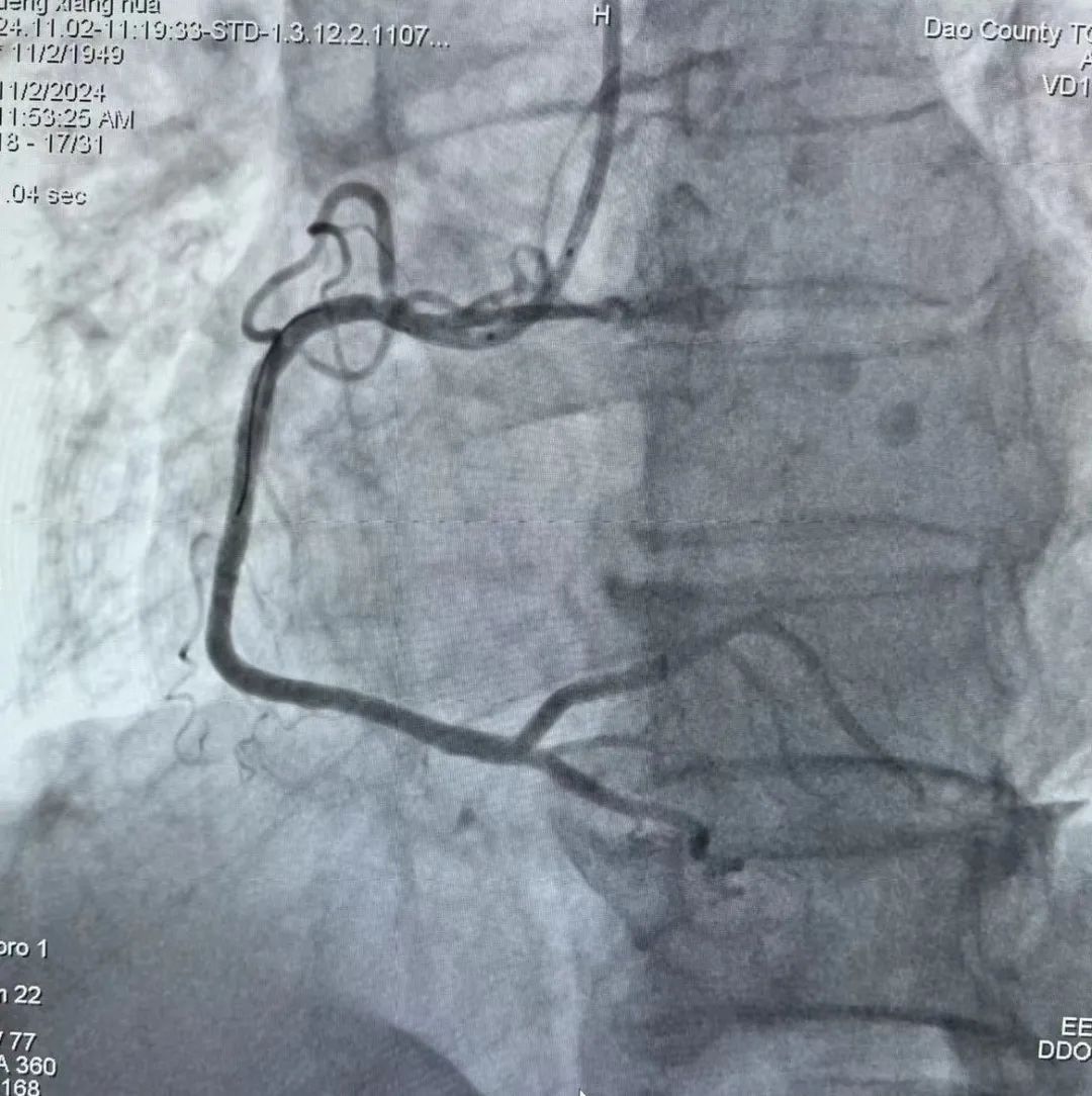 患者邓某,女性,75岁,11月2日上午因胸痛1小时呼叫120,院前急救完善心电图后考虑急性心肌梗塞,予以一键启动,给药、预谈话,畅通绿色通道,绕行急诊、绕行病房,急诊冠脉造影示右冠中段以下完全闭塞,急诊PCI,D t W 17分钟,胸痛症状缓解,转入病房后患者生命体征平稳。