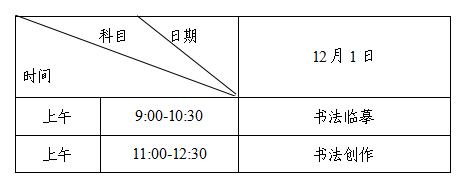 考试时间统一安排在2024年12月1日。全省考生随机编排在长沙市内若干考点,具体考试地点安排见《专业考试证》。毛笔、墨汁等考试用具由考生自备。考生须在11月30日下午17:00-18:00前往考试地点熟悉笔试考点情况,查看考室分布示意图、知晓考试注意事项和各项规定,但不能进入考试大楼和警戒线以内。考试时间具体安排如下: