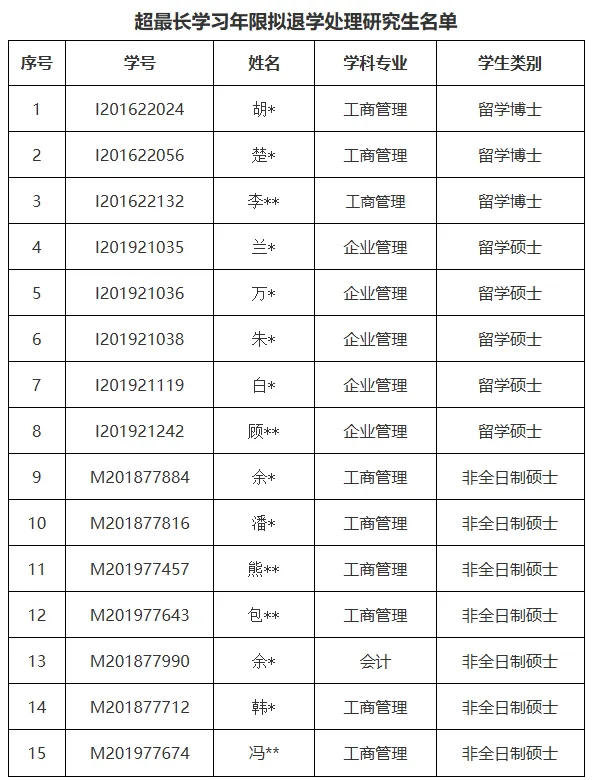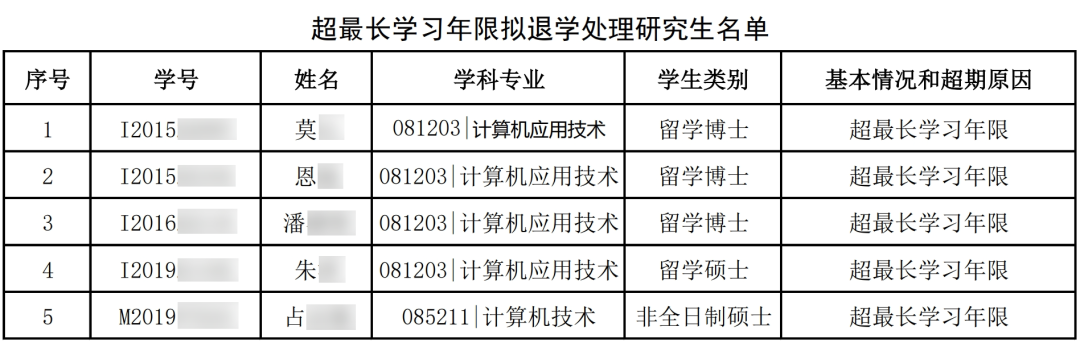 通知称,根据教育部《普通高等学校学生管理规定》(中华人民共和国教育部令第41号)第三十条及《华中科技大学研究生学籍管理实施细则》(校研【2022】3号)第十条、第三十六条、第三十七条和第三十八条有关规定,该院对在最长学习年限内未完成学业的研究生发送了《超最长学习年限拟退学处理告知书》,部分研究生在规定时间内未回复也未主动办理退学手续,现拟对该部分研究生进行退学处理。根据公示信息附件,此次华中科技大学计算机科学与技术学院一并对5名学生予以退学处理,其中留学博士3人,留学硕士1人,非全日制硕士1人,原因均为超最长学习年限。10月30日,南开大学国际教育学院官网发布了一则《关于对超过最长学习年限且无法取得联系的国际研究生拟注销学籍的公告》:根据《南开大学研究生学则》(南发字〔2024〕72号),我校于近期对已到达学校规定的最长学习年限,且未到达结业条件或休学期满未办理复学的国际研究生开展学籍清理工作,其中16人经多方努力无法联系到学生本人或家长。11月5日,山东大学公共卫生学院官网发布了一则《研究生退学处理决定公告》:根据教育部及山东大学学籍管理规定中有关退学处理意见,依《普通高等学校学生管理规定》(中华人民共和国教育部第41号令)第三章第三十条和《山东大学研究生学籍管理规定(修订)》第四十三条,拟对超过学校规定期限未注册、未履行暂缓注册且无正当事由的一名外籍硕士和两名外籍博士(学生名单见附件)予以退学处理。山东大学方面表示,鉴于无法通过邮件、电话、微信等方式送达退学决定,按照教育部第41号令要求,现决定采用公示方式送达退学决定书。公示期60天,自北京时间2024年11月5日起至2025年1月3日止,公示期满视为送达本人,退学决定自送达之日起生效。对于不同的人而言,考研的缘由可能不尽相同。但是不管是出于什么原因考研,成为研究生后需要做到就是脚踏实地,完成自己的学业任务。研究生三年的时间会比想象会快很多,部分两年制专硕时间更紧。那么团子们需要做到就是未雨绸缪,与时间赛跑。尽早确定研究方向和毕业论文选题,尽早做实验,达到毕业要求。在这之后再寻求更上一层楼,发表毕业要求之外的论文。如果能早他人一步完成这些,将拥有更多的选择权。如果团子们打算就业,那么一定要抓住春秋招的机会多进行几场面试,为自己到一份满意的工作。如果打算读博,那么就要提前关注各大院校的招生信息,看看自己是否符合要求,如果有出国的打算,则需要尽早考过雅思,明确规划,早做准备,才能做到临危不乱。