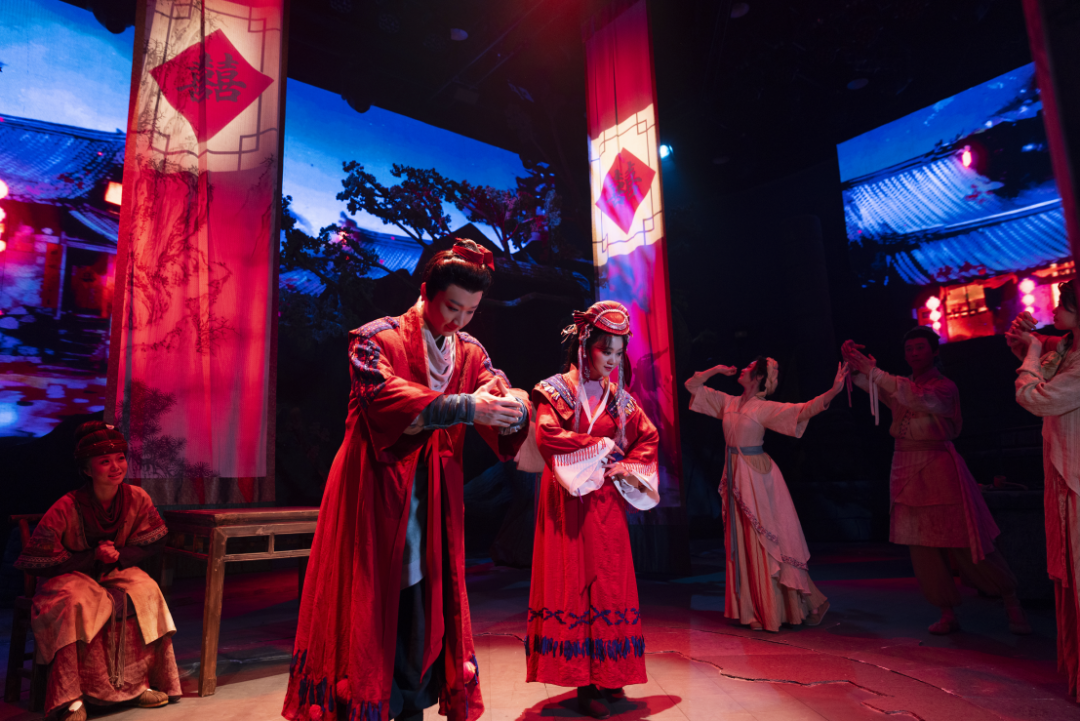 沉浸式体验、国潮范美感、现代化叙事,由湖南省花鼓戏保护传承中心联合上海音乐剧制作新锐团队“一台好戏”推出的新国风沉浸式幻境秀《新刘海砍樵》,火速出圈。