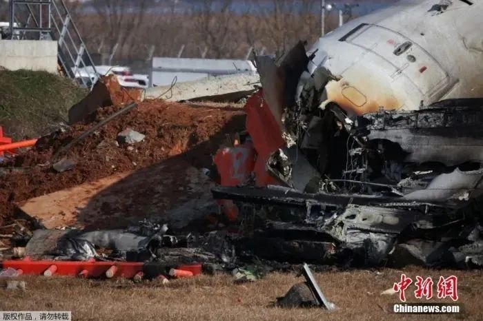 当地时间12月29日,韩国务安机场发生重大坠机事故。图为事故现场的客机残骸。
