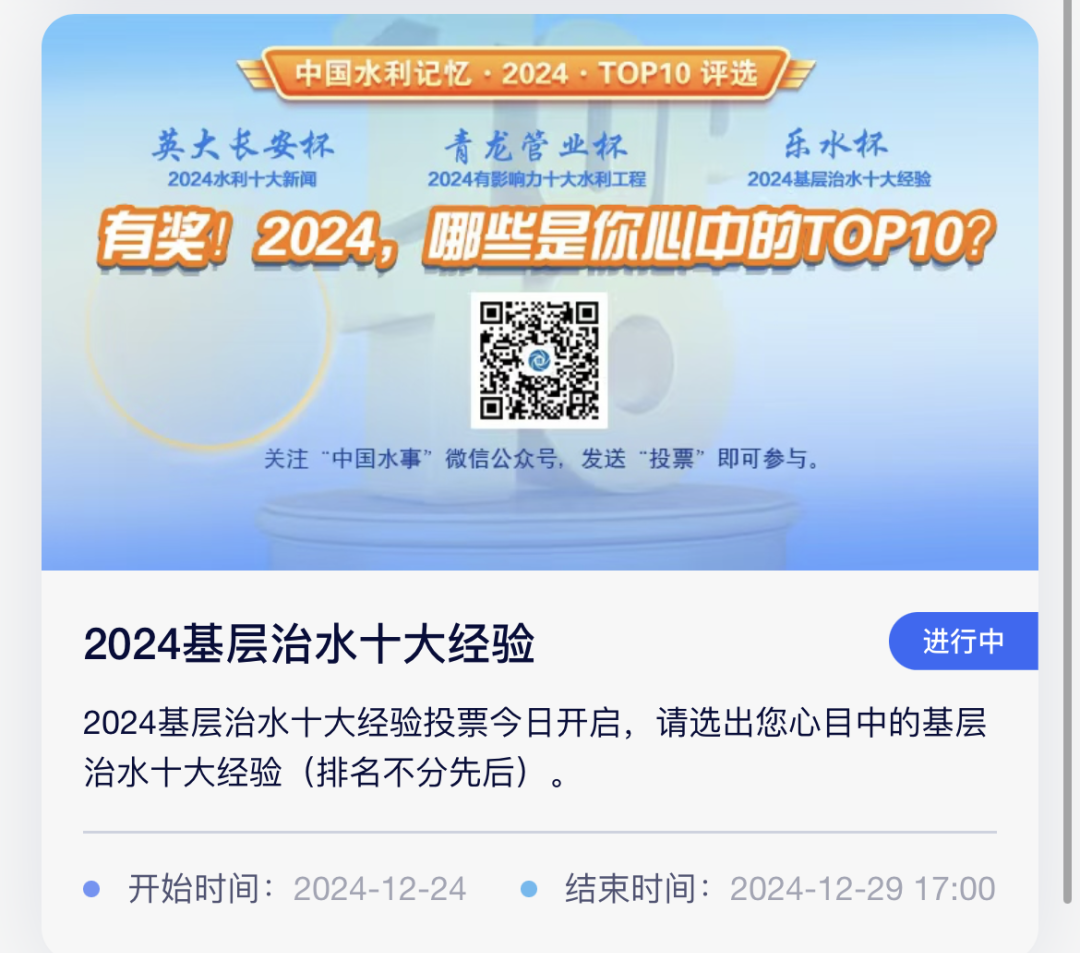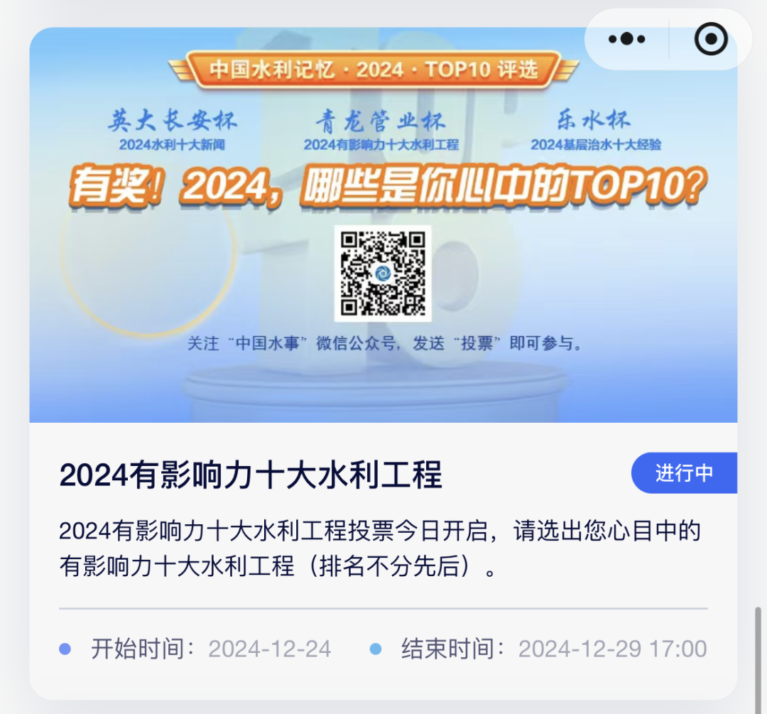 12月24日,由中国水利报社组织开展的中国水利记忆·2024·TOP10评选正式开启,拟选出2024水利十大新闻、2024有影响力十大水利工程、2024基层治水十大经验。