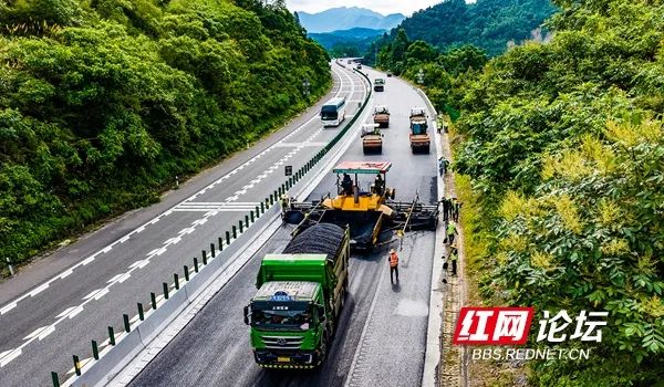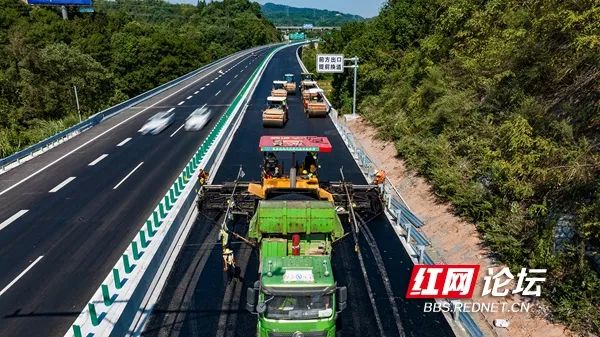 7月11日,G60邵阳至怀化高速公路一期大修工地,工程建设人员正顶着似火骄阳在摊铺路面。(拍摄:田文国)