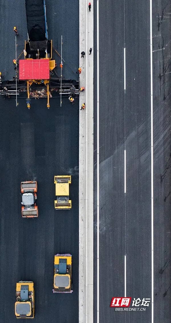 3月22日,湖南省重点工程项目沅(陵)辰(溪)高速公路,施工人员正抢抓有利天气,抓紧路面铺装。(拍摄:田文国)