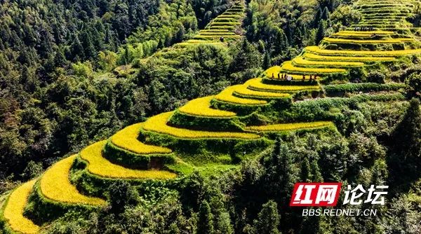 9月27日,溆浦县葛竹坪镇山背花瑶梯田层层叠叠,一片金黄,呈现出美丽的丰收景象。(拍摄:田文国)