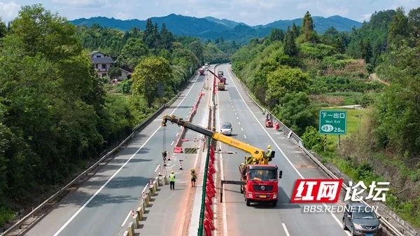 8月22日,G60沪昆高速公路怀(化)新(晃)段,湖南省高速公路集团怀化分公司的工程建设者们不惧“烤”验,冒着酷暑抢抓工程进度,进行高速公路中央分隔带护栏提升改造工程施工。(拍摄:田文国)
