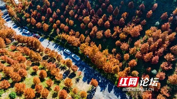 11月30日,怀化市鹤城区海拔600多米帽子坡的水杉层林尽染、色彩斑斓、宛如画卷,吸引了众多游客前来观赏打卡。(拍摄:田文国)