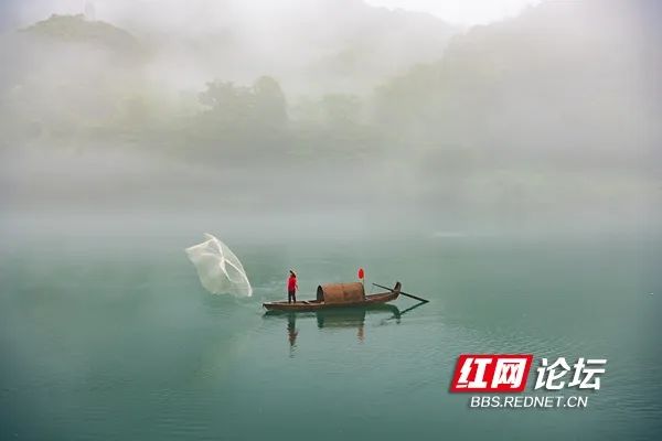 6月16日,郴州资兴市的小东江景区,晨雾中渔夫划着小舟撒出渔网。(拍摄:田文国)