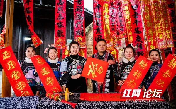 2月2日,麻阳苗族自治县隆家堡乡霞飞云果园内张灯结彩,苗家阿哥阿妹打起糍粑、写上春联、跳起舞蹈,与游客和村民喜迎新春佳节的到来。(拍摄:田文国)