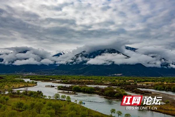 4月20日,位于西藏雅鲁藏布江与尼洋河交汇处的雅尼国家湿地公园一带,白云、雪峰、群山与江水、树木相映成景,构成一幅美丽的乡村生态画卷。(拍摄:田文国)