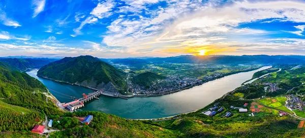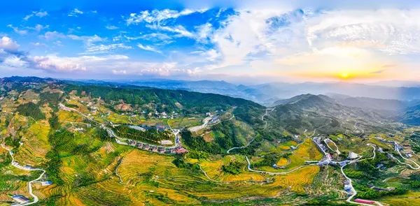 8月27日,夕阳下,中方县铜湾镇沅江两岸,错落有致的民居与丰收在望的田野、青山、河流、高铁、电站等相映成景,构成了一幅美丽的乡村田园生态画卷。(拍摄:田文国)