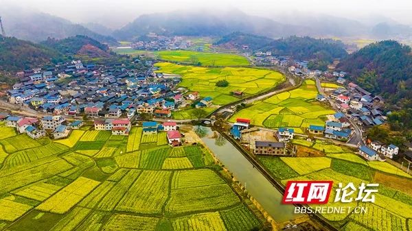 3月9日,中方县铜湾镇黄溪古村,盛开的油菜花与晨雾、青山、碧水、古村落交相辉映,构成一幅美丽乡村的画卷。(拍摄:田文国)