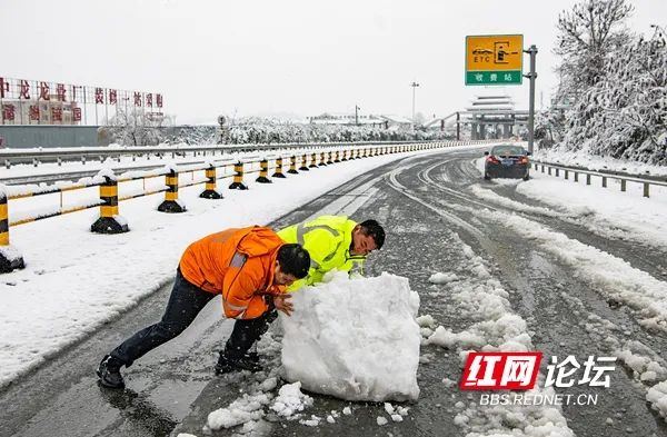 1月22日,湖南高速公路集团员工对境内高速公路除雪保畅通。(拍摄:田文国)