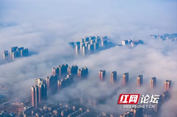 2月11日清晨,怀化城区被大雾笼罩,飞云之上,高楼在云雾中若隐若现,整个城市宛如“天空之城”。(拍摄:田文国)
