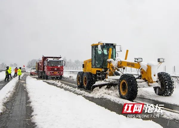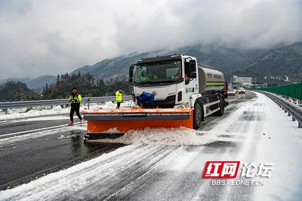 1月22日,湖南高速公路集团怀化分公司启动平地机、融雪剂撒布车对境内高速公路除雪保畅通。(拍摄:田文国)