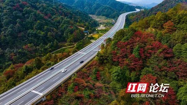 11月9日,芷江侗族自治县境内的芷(江)铜(仁)高速公路两旁崇山峻岭在初冬阳光的映照下丛林尽染、美不胜收。车行其中,如在画中游。(拍摄:田文国)