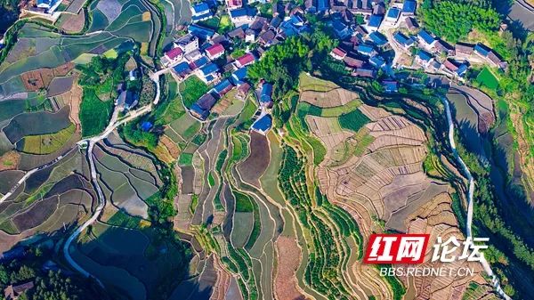 5月29日,中方县铁坡镇江坪村,层层叠叠的梯田与群山、民居交相辉映,构成一幅秀丽的田园画卷。(拍摄:田文国)