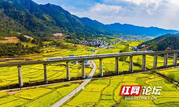 3月23日,沪昆高铁列车从中方县开满油菜花的田垄中穿行而过,构成了一幅美丽的田园风景画。(拍摄:田文国)
