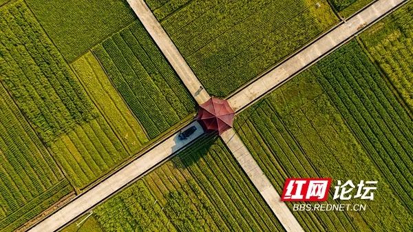 8月24日,怀化境内G65包茂高速和长芷高速交汇的朱溪互通与周围金灿灿的稻田、各色农舍交相辉映,美丽如画。(拍摄:田文国)