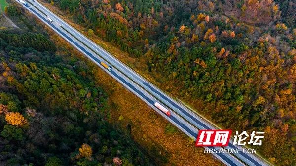 12月14日,怀化市境内的包茂高速公路两旁丛林尽染、色彩斑斓。(拍摄:田文国)