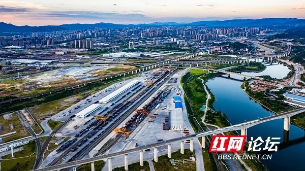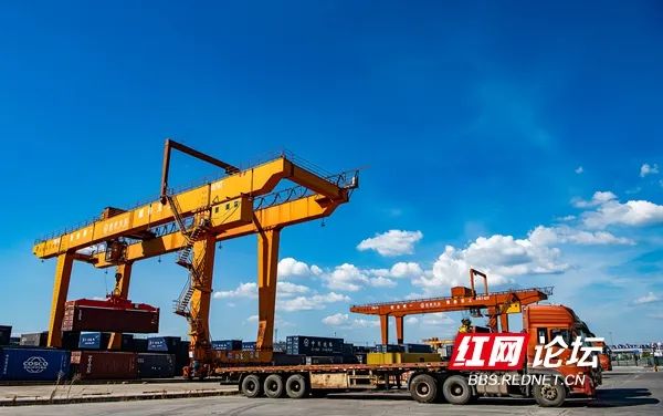 7月18日傍晚,怀化国际陆港货场集装箱整齐堆放,龙门架起重机正在紧张的装卸货物。怀化是西部陆海新通道“13+2”省际协商合作机制成员之一,是湖南唯一面向东盟的货运集结中心。怀化国际陆港已开拓北部湾铁海联运及中老、中越、中缅等四条国际物流大通道。(拍摄:田文国)
