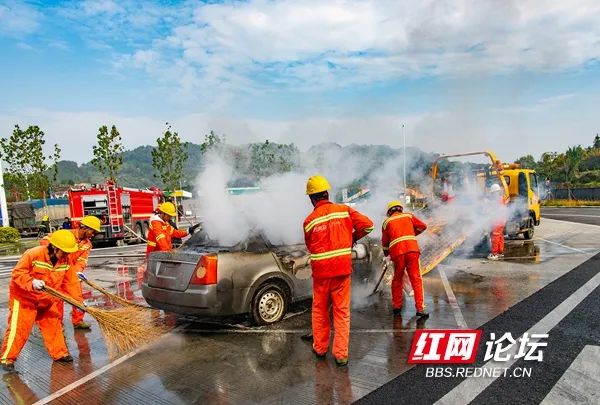 11月7日,沅辰高速公路建设开发公司在辰溪北服务区举行了一场汽车自燃事故应急演练。(拍摄:田文国)