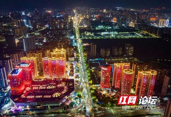 9月10日晚,怀化市鹤城区各大街小巷张灯结彩,高楼大厦灯光璀璨,街头霓虹灯五彩斑斓,迎接全球湘商大会的召开。(拍摄:田文国)