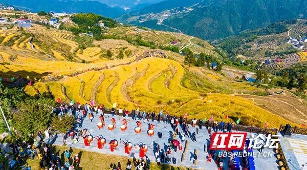 10月10日,溆浦县葛竹坪镇山背花瑶梯田,满目金黄。当天,该县举行打禾、捉鱼、水田拔河、草垛寻宝等丰富多彩的活动,村民和游客共享丰收喜悦。(拍摄:田文国)