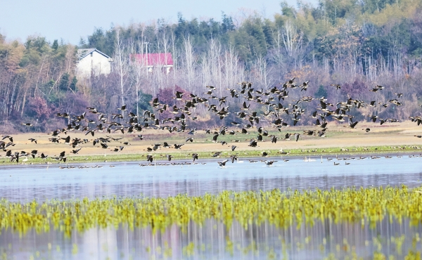 12月29日,临湘市黄盖湖自然保护区,大雁在清澈的水面上飞行,为保护区增添了一份独特魅力。近年来,经过不断治理,黄盖湖水域生态环境得到了显著改善,今年来此栖息越冬的候鸟有5万多只,成了湖南省第二大越冬候鸟栖息地。