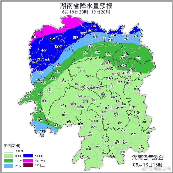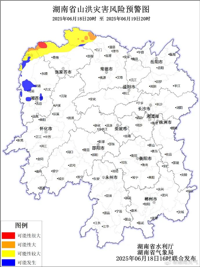 根据省气象局6月18日预报,省水利厅与省气象局联合会商得出如下结论:受降雨影响,18日20:00至19日20:00,张家界市、常德市、湘西州等地可能发生山洪灾害,具体如下。