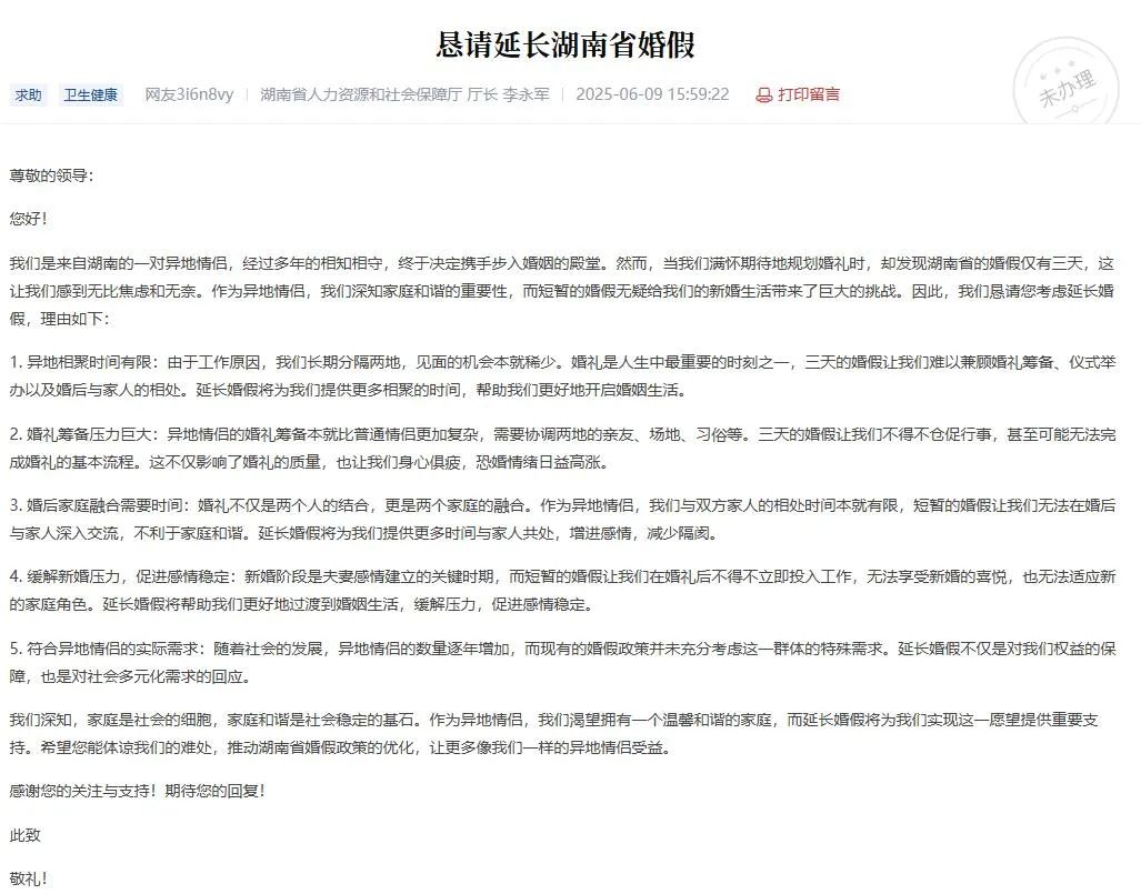 以至于有网友都在问政湖南上发帖,希望能够延长婚假时间,让异地工作的新婚夫妻能够有更多的相处时间。