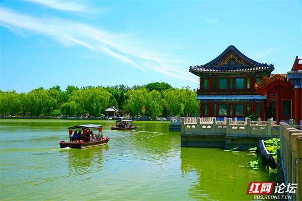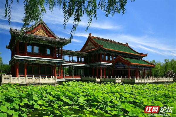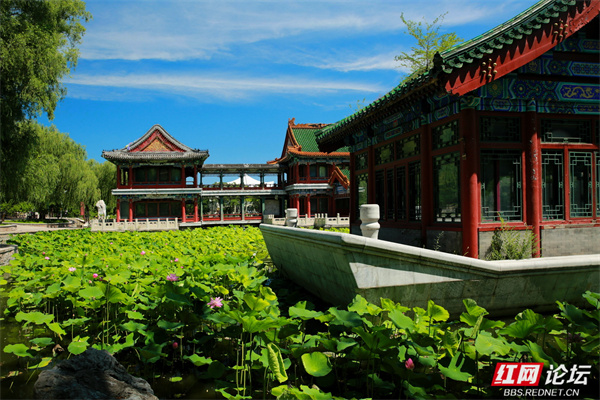 当蝉鸣尚未织就盛夏的燥热,晨光微醺时,我踏入了北京龙潭公园的绿意版图。湖面上,荷花已擎起粉白的“灯盏”,田田荷叶如翠玉铺展,倒映着天光云影。碧水托举着花瓣的柔媚,日光穿透花瓣时,连脉络都泛着剔透的光晕,恰似工笔画里晕染开的色彩,在绿叶与波光间愈显明艳。古典建筑以琉璃瓦为冠、朱红廊柱为骨,错落点缀在葱茏绿意中——飞檐翘角挑着流云,红墙与碧树相映成趣。
