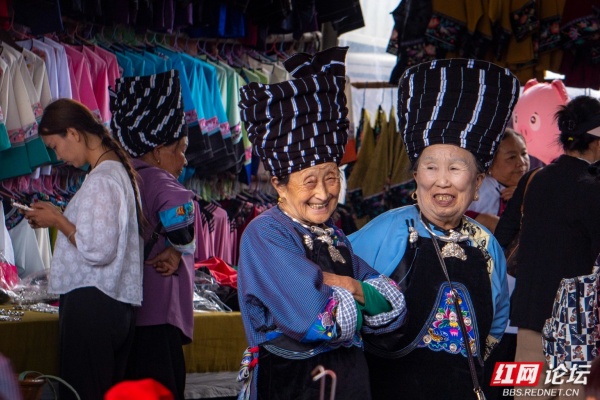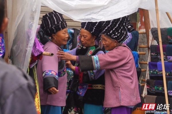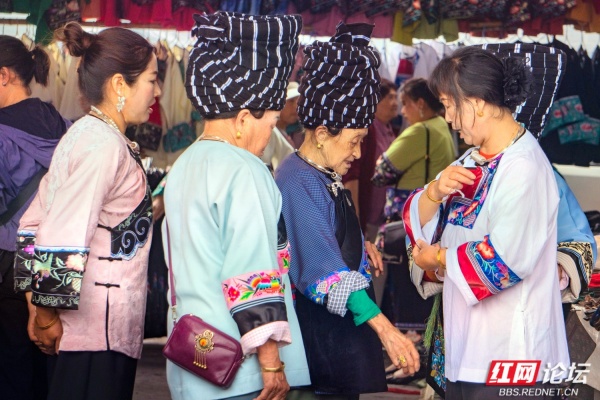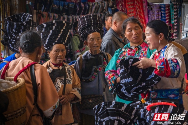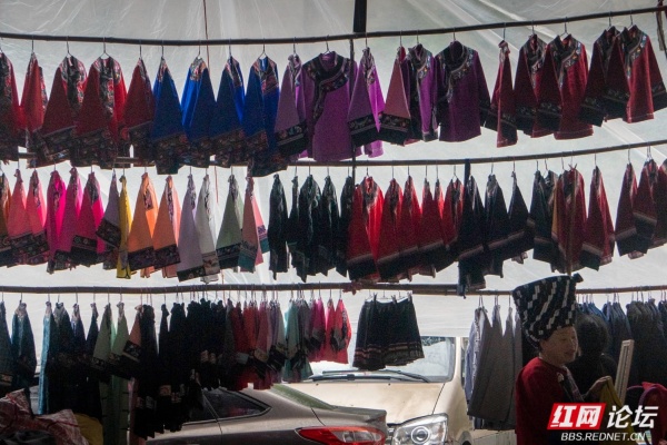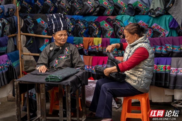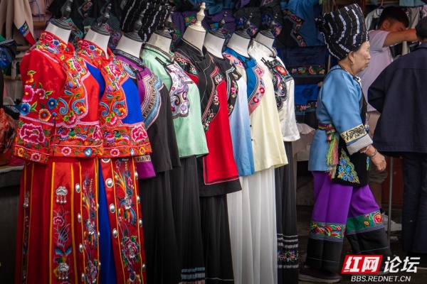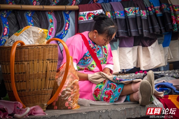 苗乡的圩场简直就是别样的花花世界。摊位上高悬的是层层叠叠的花衣服,苗家女人身上穿的是大红大绿的花衣服。无领衣服的胸前斜边是花的,宽大袖口的贴边是花的,大裤管下方的宽横条是花的,女人的围裙是花的,背包是花的,背孩子的背带是花的,这些彩色的花边、花条、花带子亮丽,醒目。我想,这些花边、花条、花带子的存在,不仅是一种装饰,更是苗家女人服饰的灵魂,没有了这些花边、花条、花带子,苗家女人的服饰必将黯然。我的镜头关注最多的便是这些花衣苗服。
