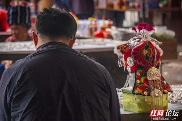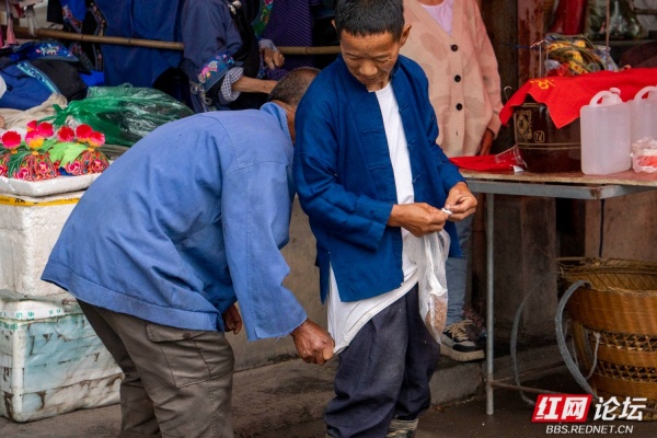在拥挤的人群里,有两位苗家男子,个子不高,看不出年龄。后面的男子猫着腰扯着前面男子的“衣尾巴”,随着前面男子微笑着回头的方位,他朝反方向左边躲躲,右边闪闪,脸上溢满着神秘的憨笑。这样的动作不是每个外地人都懂的,但我知道,那是后面男子让前面男子猜猜自己是谁。