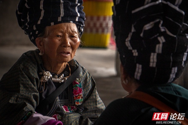 如果说花边花条苗银是苗家女性服饰的灵魂所在,那么苗家女人头上高大的深色木桶帽就是苗家女人服饰的吸睛之笔。三四十公分高的饰物,像一个上宽下窄的厚重木桶安放在女人的头上。这饰物有保暖作用,是毋庸置疑的。但我不能理解的是这里的女人夏天顶着这个“大木桶”,不热么?她们在地里锄草田里插秧背着柴火还是顶着这个“大木桶”,方便么?这应该还是有不为我们外人知晓的说头吧。