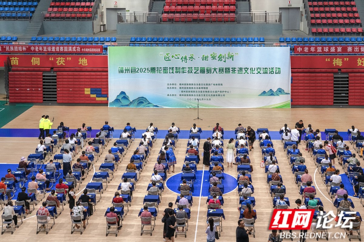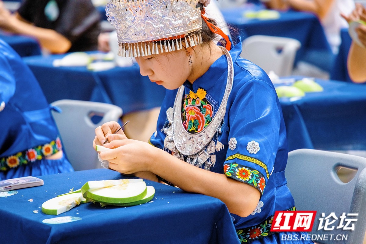 ▲图说:2025年7月19日,靖州苗族侗族自治县体育中心内,刻刀飞舞,青果飘香。一场名为“匠心传承·甜蜜创新”的雕花蜜饯制作技艺大赛火热举行,老、中、青三代“蜜饯巧匠”同台竞技,展现非遗技艺的独特魅力。