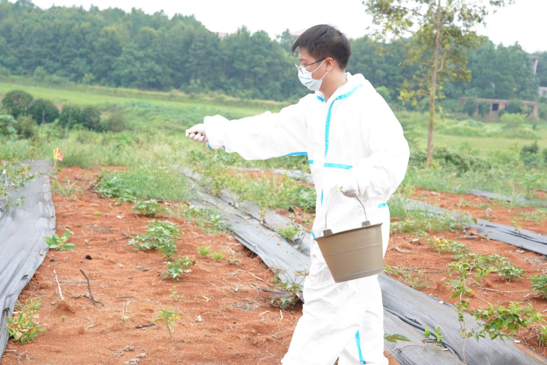 技术人员演示撒施药剂方法