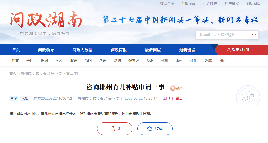近日,网友“036752”在红网《问政湖南》栏目留言,咨询育儿补贴申请渠道、流程等相关问题。对此,郴州市卫生健康委作出回应。